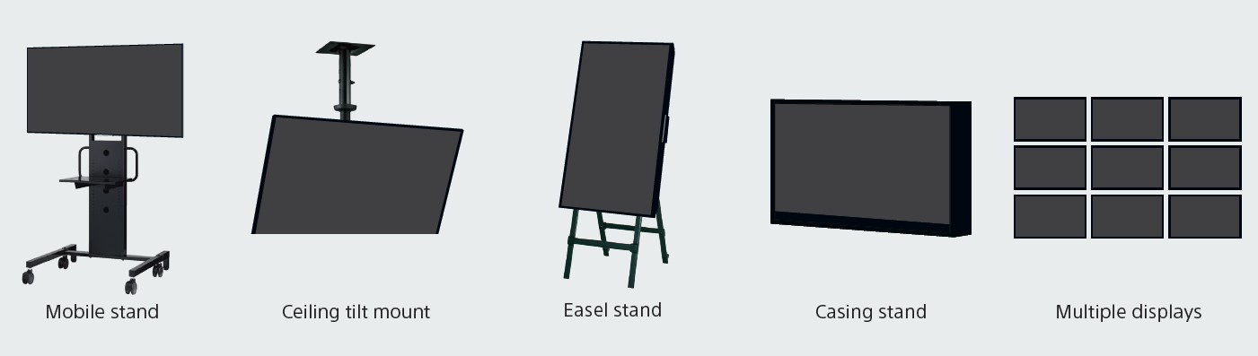 În plus față de instalarea în landscape, portret și înclinare, ecranele BRAVIA Pro pot fi utilizate cu suporturi mobile pentru o instalare eficientă.