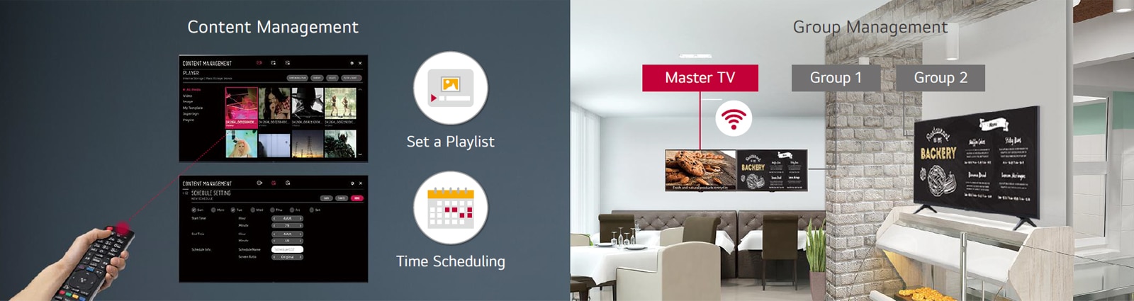 Sistemul încorporat de gestionare a conținutului și grupurilor permite editarea și redarea conținutului, programarea listelor de redare și grupurilor, precum și controlul semnalisticii prin telecomandă, mouse și telefon mobil, fără a fi nevoie de un PC sau software separat. Acest lucru face gestionarea conținutului simplă și accesibilă utilizatorilor.