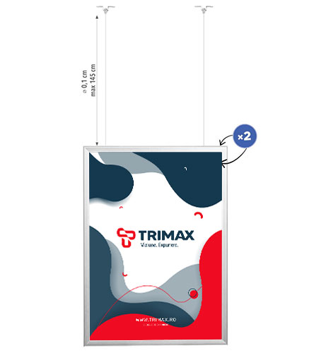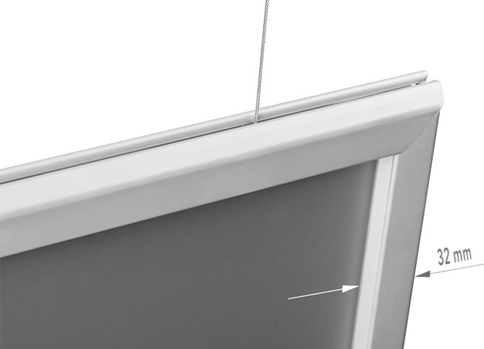 Sistemul „clip-clap” este o înlocuire rapidă și fără probleme a posterului, care durează câteva secunde. Un cablu puternic de oțel garantează o suspendare sigură și stabilă a cadrului. Setul include suporturi pentru montarea cadrului pe tavan.